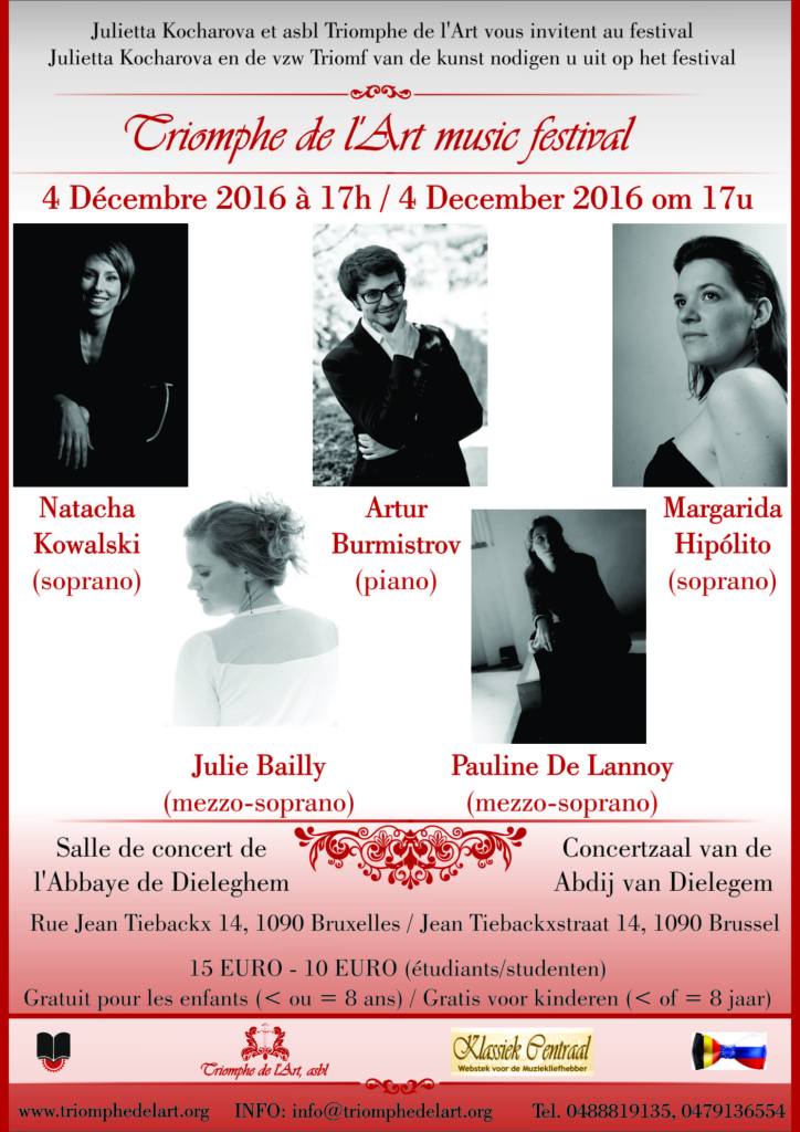 Naar aanleiding van de eindejaarsfeesten, nodigen Julietta Kocharova en het Muziekfestival ‘Triomf van de Kunst’ u uit voor het sprookjesachtig kertconcert. Jonge en getalenteerde solisten uit Europese operahuizen zullen u meesterwerken van de grootste muzikale genieën brengen. U zal zo ook een wedijver horen tussen twee stemsoorten en dit onder leiding van pianist Artur Burmistrov.