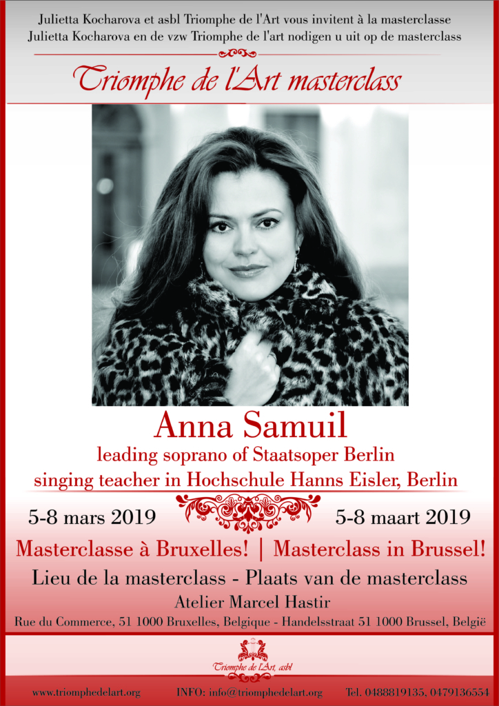 Due to many requests and applications to the previous masterclass (exceeding the number of available places) in February 2019, Triomphe de l’Art, asbl and Anna Samuil decided to organize another masterclass in March 2019.